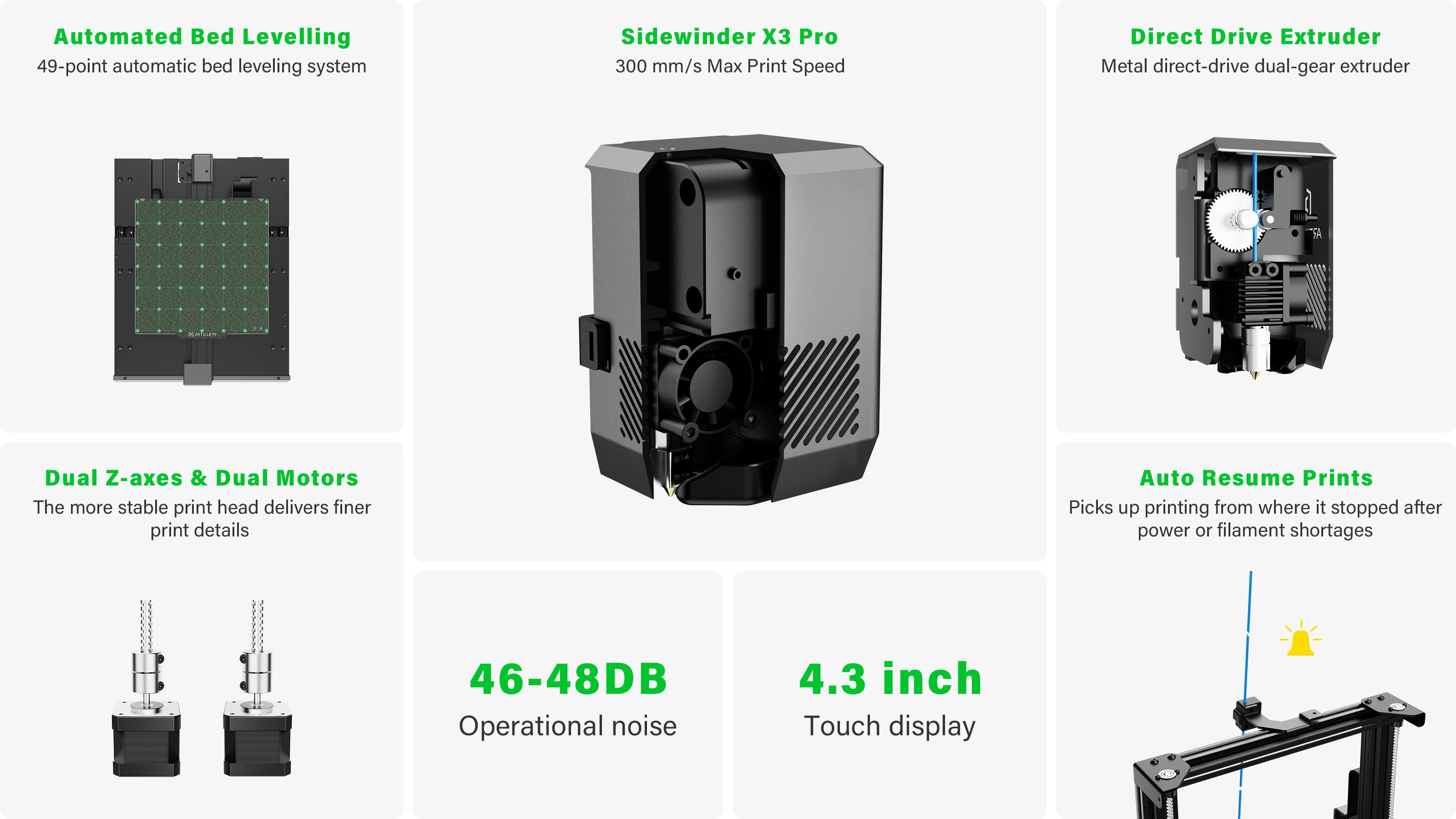 Offers a generous 240×240×260 mm build area, suitable for a variety of projects. Equipped with a 4.3-inch full-color touchscreen, ensuring an intuitive and user-friendly interface for seamless operation.